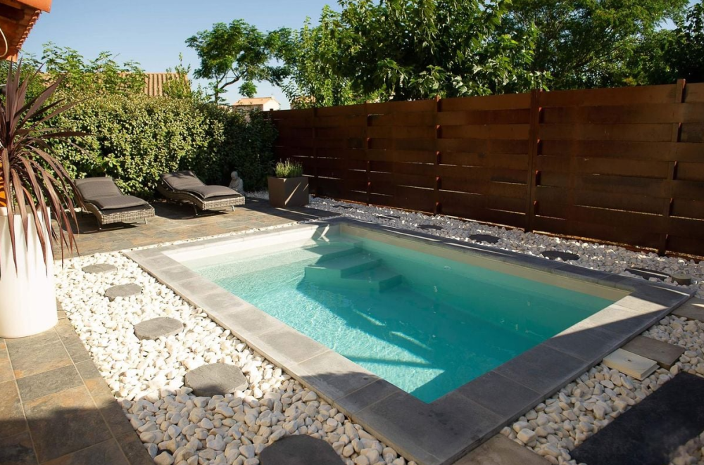 Optez pour la mini piscine coque Lipsi, une création signée Mediester alliant design compact et ingéniosité pour sublimer les petits espaces extérieurs.