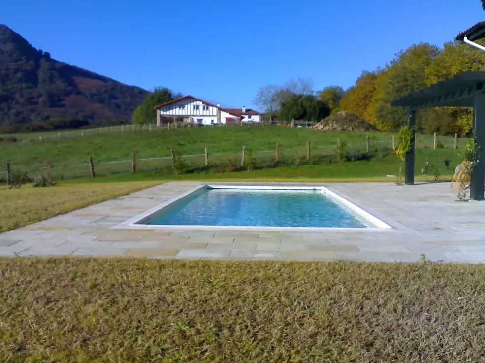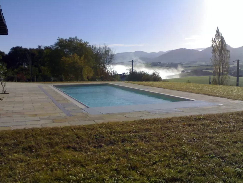 Un design rectiligne et contemporain, un fond plat de 1.50 m, le tout sublimé par une élégante terrasse en pierres naturelles posée par notre équipe.
