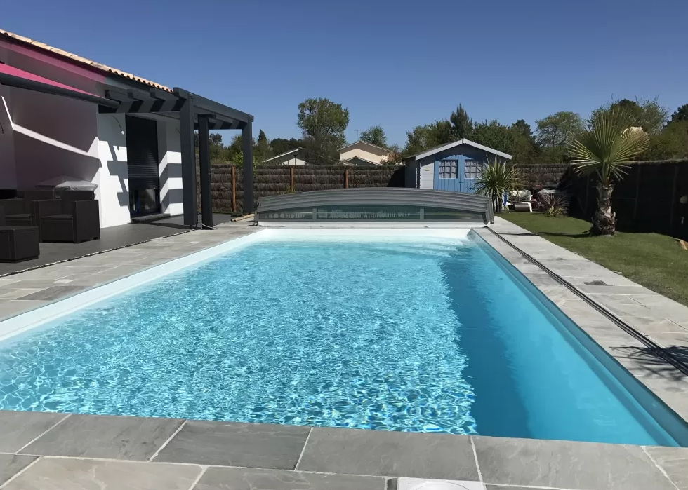 Profitez d'une saison de baignade prolongĂ©e grĂące Ă son abri bas, et apprĂ©ciez la beautĂ© et la sĂ©curitĂ© de sa terrasse en pierres naturelles grises antidĂ©rapantes pour le bien-ĂȘtre de toute la famille.
