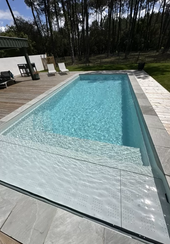 Ses lignes contemporaines s’intègrent parfaitement à l’environnement extérieur, tandis que la large plage immergée invite à la détente et aux moments de farniente, les pieds dans une eau limpide. Le volet immergé, totalement discret, préserve l’esthétique du bassin tout en garantissant une sécurité optimale.