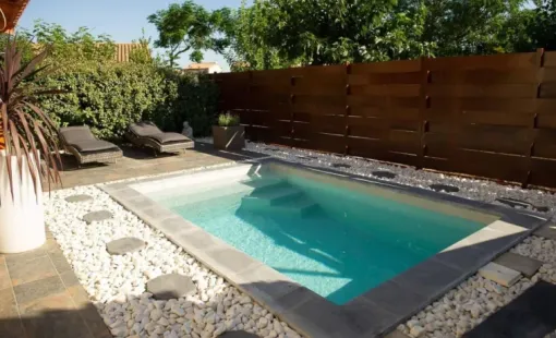 Craquez pour la mini piscine coque LIPSI, une réalisation Mediester pensée pour optimiser les petits extérieurs…